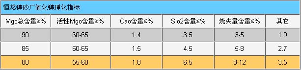 氧化鎂(MgO)俗稱菱苦土、輕燒粉、鎂氧粉。密度2.94,白色粉末。熔點2852℃,沸點3600℃。溶于酸和銨鹽,難溶于水和乙醇。煅燒溫度400℃時比表面積為180m2/g。1300℃時比表面積僅為3m2/g。在空氣中易潮解。它屬于氣硬性的膠結(jié)材料。